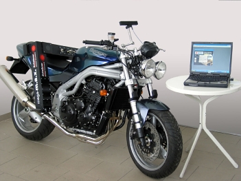 Der Messbügel wird mittels entsprechenden Aufnahmedornen z.B. in der Bohrung der Schwingenachse fixiert und im Fahrzeugheck abgestützt. Der Zielkörper wird mittels Stativsystem an der Fahrzeugfront im Lenkkopfbereich befestigt. Im Laptop und der entsprechenden speziellen Software wird die Auswahl des Fahrzeugtyps aus der Datenliste getroffen und die Vermessung gestartet. Abschließend stellt das Programm das Messergebnis im Vergleich mit den Herstellervorgaben auf dem Display des PCs dar. Wir erarbeiten noch eine zusätzliche Erläuterung der Messergebnisse in Bezug auf den Fahrzeugzustand und setzen beides in Relation. Nach Abschluss der Vermessung erhalten Sie das Vermessungsprotokoll und die gesonderten Erläuterungen in gedruckter und elektronischer Form. Das Protokoll ist ein offiziell anerkanntes Dokument, welches vom BdZS zertifiziert ist.